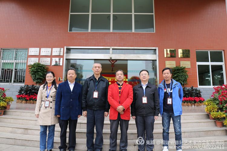 福建船政交通職業學院院長陳錦輝(右2)、書記張海明(左3)、福建省雕刻藝術家協會船政畫院執行院長陳文漢、副院長李靖商談捐贈船政主題的書畫作品后集體合影。