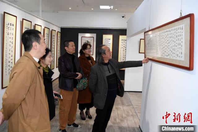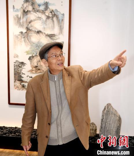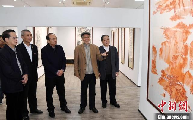 著名藝術家沈巖先生(右二)向來賓介紹在館內展出、由他本人創作的80多幅書畫作品。