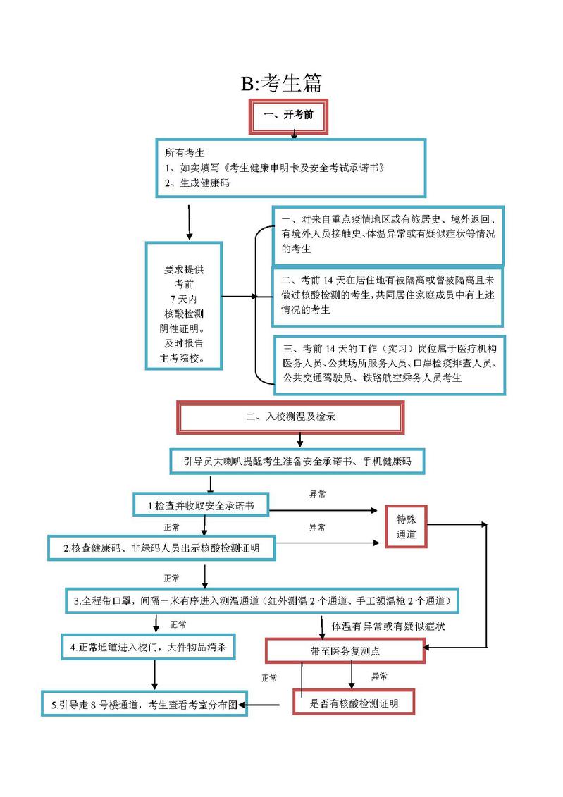 1.來自重點疫情地區或有旅居史、境外返回、境外人員接觸史、體溫異常或有疑似癥狀等情況,考前14天曾被隔離或曾被隔離未做過核酸檢測、共同居住家庭成員有上述情況的考生,考前14天的工作(實習)崗位屬于醫療機構醫務人員、公共場所服務人員、口岸檢疫排查人員、公共交通駕駛員或鐵路航空乘務人員的考生,上述考生須提供考前7天內核酸檢測陰性證明后方可進入學校,無提供核酸證明者不得進入校園!