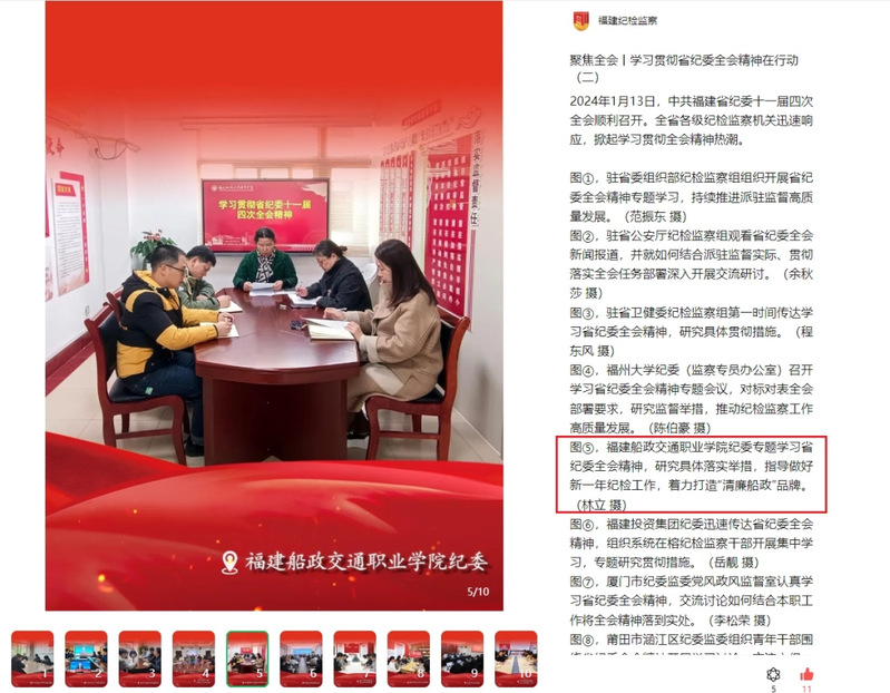 1月17日,福建省紀委監委官網、福建紀檢監察微信公眾號報道學院紀委專題學習省紀委十一屆四次全會精神,內容如下: