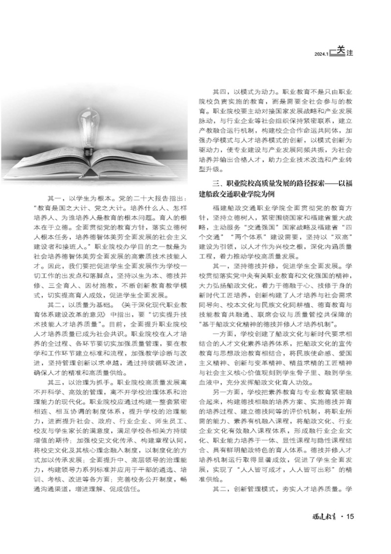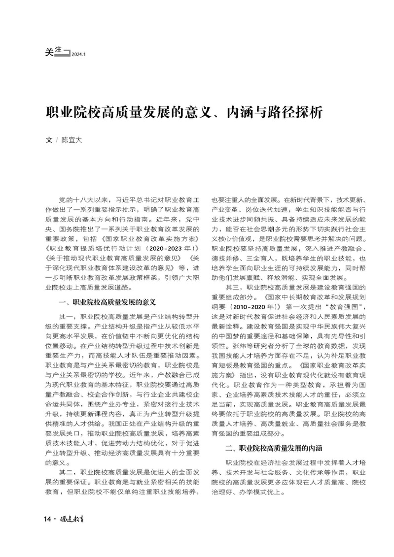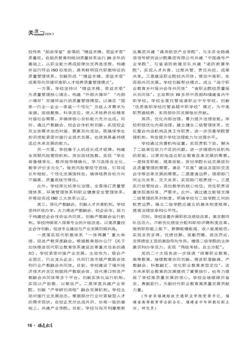 福建省教育廳主管、福建教育雜志社主辦的教育專業期刊《福建教育》2024年第4期“關注”職業教育高質量發展筆談欄目,刊發了學院黨委書記陳宜大筆談文章,對職業教育高質量發展的目標、內涵、路徑、策略等進行深入探討,內容如下: