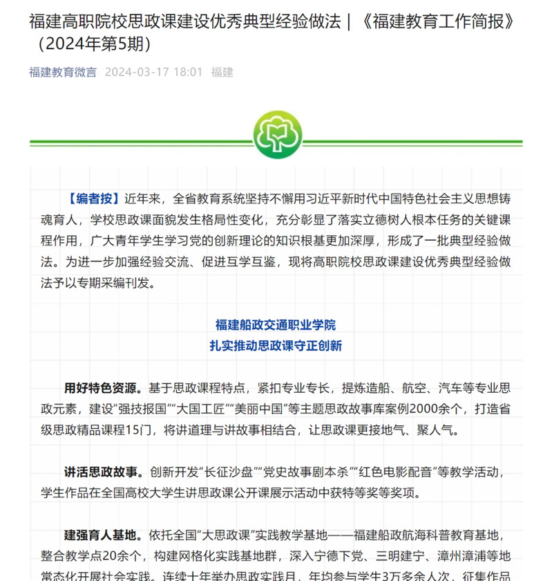 建強育人基地。依托全國“大思政課”實踐教學基地——福建船政航海科普教育基地,整合教學點20余個,構建網格化實踐基地群,深入寧德下黨、三明建寧、漳州漳浦等地常態化開展社會實踐。連續十年舉辦思政實踐月,年均參與學生3萬多余人次,征集作品2萬余件。
