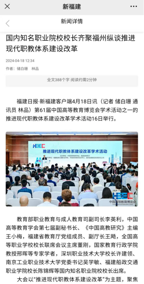 福建日報·新福建客戶端4月18日訊(記者 儲白珊 通訊員 林品)第61屆中國高等教育博覽會學術活動之一的推進現代職教體系建設改革學術活動16日舉行。
