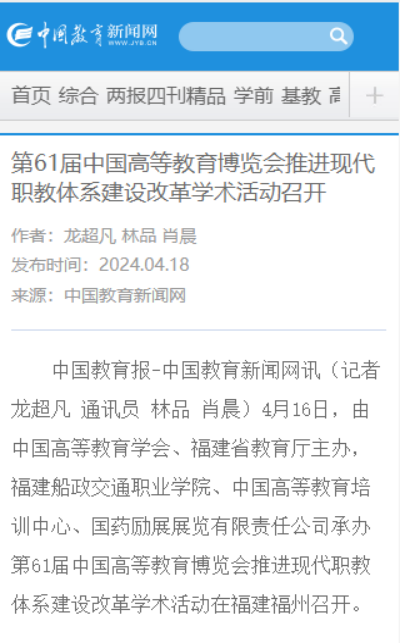 中國教育報-中國教育新聞網訊(記者 龍超凡 通訊員 林品 肖晨)4月16日,由中國高等教育學會、福建省教育廳主辦,福建船政交通職業學院、中國高等教育培訓中心、國藥勵展展覽有限責任公司承辦第61屆中國高等教育博覽會推進現代職教體系建設改革學術活動在福建福州召開。