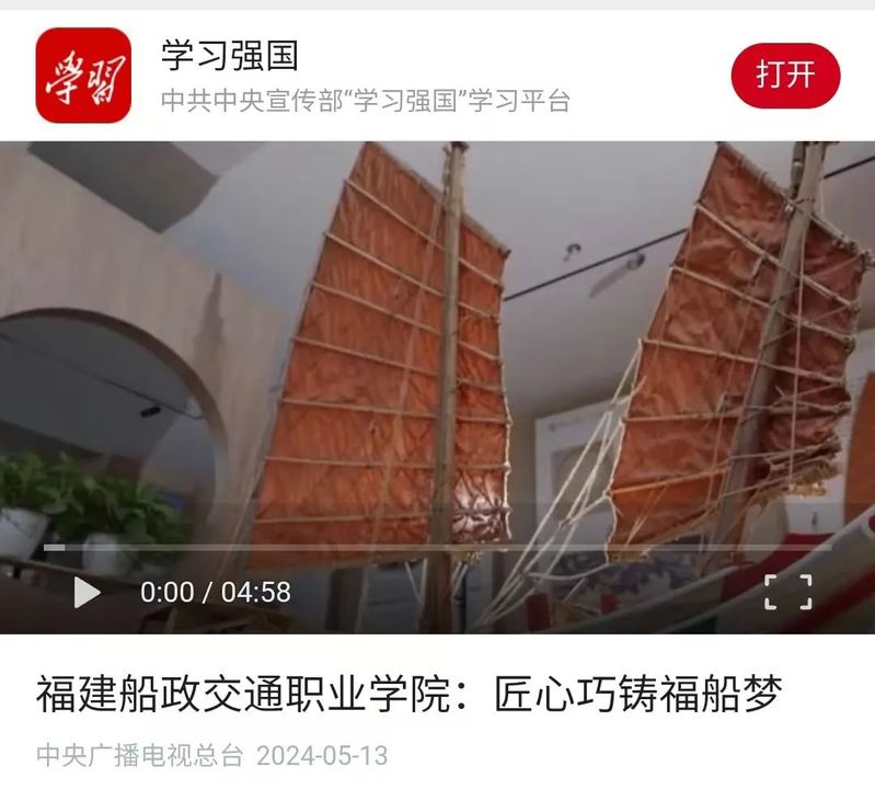 日前,中央廣播電視臺學習強國平臺推送我院非物質文化遺產福船紀錄片《匠心巧鑄福船夢》,對我院水密隔艙福船制造技藝的傳承與發揚,精益求精、密益求密的工匠精神進行宣傳。