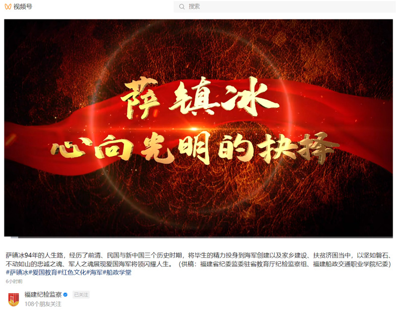 11月29日,由福建省紀委監委駐省教育廳紀檢監察組和福建船政交通職業學院紀委聯合制作的船政先賢家風家訓宣傳片《薩鎮冰:心向光明的抉擇》在“福建紀檢監察”視頻號推送。