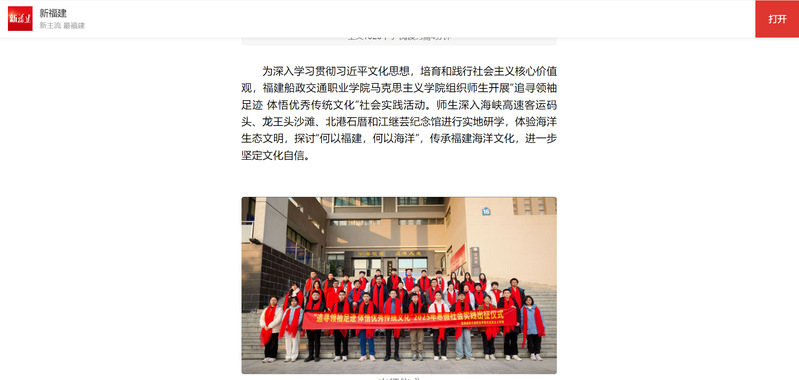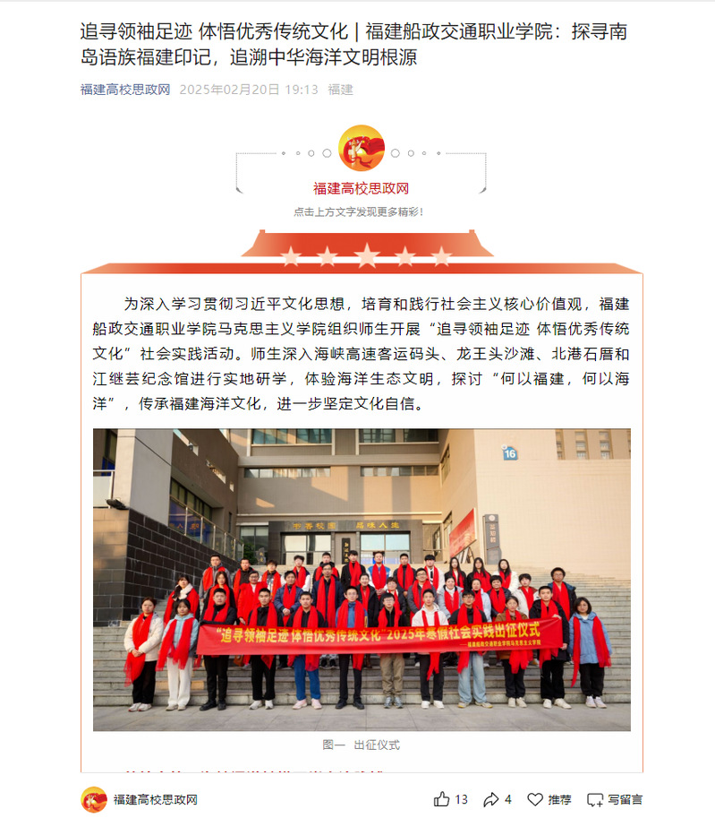 近日,新福建、高校思政網等主流媒體平臺報道我院開展“追尋領袖足跡 體悟優秀傳統文化”社會實踐活動。