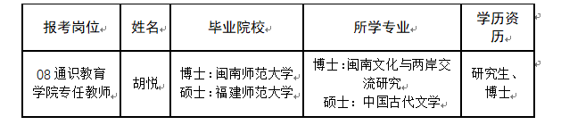 按照《關于印發<福建省省屬事業單位公開招聘工作人員考試暫行辦法>的通知》(閩人發〔2006〕11號)和《2024年福建船政交通職業學院專項公開招聘總量控制高層次人才方案(二)》等文件要求,經報名、資格審查、面試、考察、體檢等有關程序,經學校黨委會議研究,確定胡悅為08通識教育學院專任教師擬聘用人員,現予以公示。