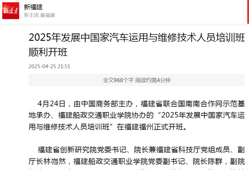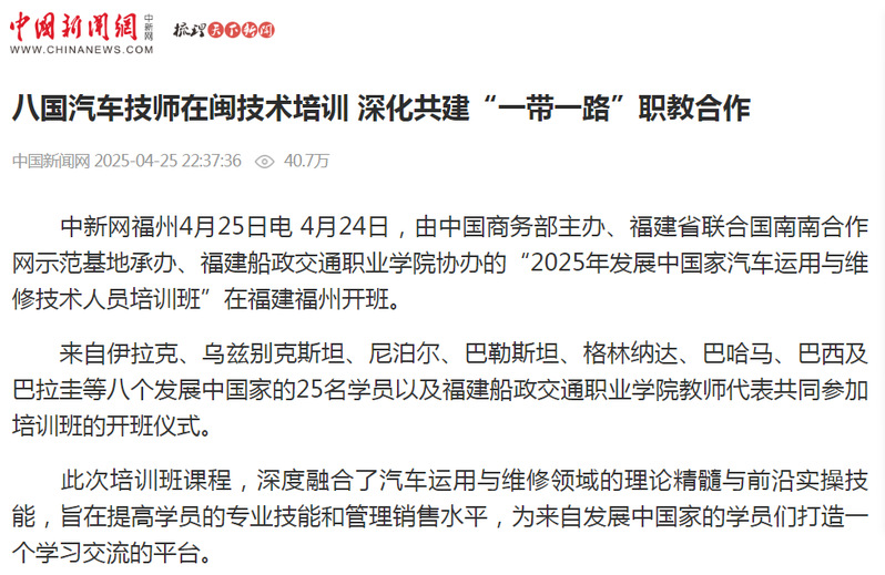 中新網福州4月25日電 4月24日,由中國商務部主辦、福建省聯合國南南合作網示范基地承辦、福建船政交通職業學院協辦的“2025年發展中國家汽車運用與維修技術人員培訓班”在福建福州開班。 來自伊拉克、烏茲別克斯坦、尼泊爾、巴勒斯坦、格林納達、巴哈馬、巴西及巴拉圭等八個發展中國家的25名學員以及福建船政交通職業學院教師代表共同參加培訓班的開班儀式。 此次培訓班課程,深度融合了汽車運用與維修領域的理論精髓與前沿實操技能,旨在提高學員的專業技能和管理銷售水平,為來自發展中國家的學員們打造一個學習交流的平臺。 培訓期間,學員們將前往寧德時代、寧德上汽和廈門金龍等企業參觀考察,與一線從業人員深入交流,近距離洞察汽車產業的最新技術趨勢與行業脈動,汲取國際領先的企業管理經驗與創新實踐成果。 發展中國家汽車運用與維修技術培訓班迄今已承辦2期,共來自13個發展中國家的54名學員參加教學培訓。作為共建“一帶一路”教育行動的實踐案例,福建船政交通職業學院與中航國際合作,在肯尼亞、烏干達、科特迪瓦、加蓬等國家設立職業教育基地,提供師資培訓和職業教育支持,培養當地職業技術人才;聯合廈門金龍等本土企業,創新實施“海外技師培養計劃”,在中東、非洲等地共建“海絲學院”,形成“技術培訓-產業孵化-文化互鑒”的立體化合作矩陣。福建船政交通職業學院相關負責人表示,未來,該校將與各友好國家繼續堅持共商共建共享原則,加強互聯互通合作,合力講好船政交通人共建“一帶一路”故事,為全球職業教育共同體建設注入中國智慧和責任擔當。(完)4月24日,由中國商務部主辦,福建省聯合國南南合作網示范基地承辦、福建船政交通職業學院協辦的“2025年發展中國家汽車運用與維修技術人員培訓班”在福建福州正式開班。福建省創新研究院黨委書記、院長兼福建省科技廳黨組成員、副廳長林巋然,福建船政交通職業學院黨委副書記、院長陳群,副院長陳常暉與來自伊拉克、烏茲別克斯坦、尼泊爾、巴勒斯坦、格林納達、巴哈馬、巴西及巴拉圭等8個發展中國家的25名學員以及學院教師代表共同參加培訓班的開班儀式。開班儀式由福建省聯合國南南合作網示范基地主任張華主持。