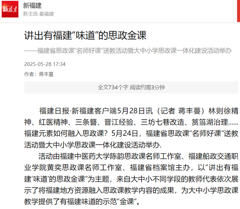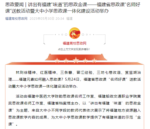 福建日報·新福建客戶端5月28日訊(記者 蔣豐蔓)林則徐精神、紅醫精神、三條簪、晉江經驗、三坊七巷改造、筼筜湖治理......福建元素如何融入思政課?5月24日,福建省思政課“名師好課”送教活動暨大中小學思政課一體化建設活動舉辦。 活動由福建中醫藥大學陳韻思政課名師工作室、福建船政交通職業學院黃奕思政課名師工作室、福建省檔案館主辦,以“講出有福建‘味道’的思政金課”為主題,來自大中小不同學段的教師代表依次展示了將福建地方資源融入思政課教學內容的成果,為大中小學思政課教學提供了有福建味道的示范“金課”。