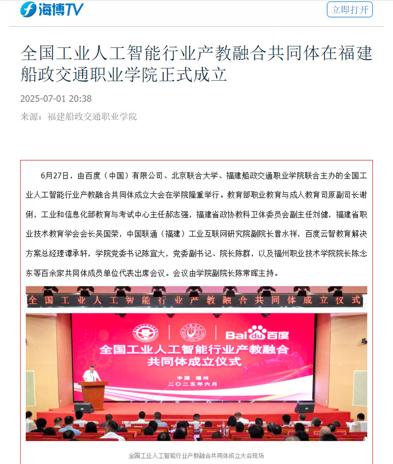 6月27日,由百度(中國)有限公司、北京聯合大學、福建船政交通職業學院聯合主辦的全國工業人工智能行業產教融合共同體成立大會在學院隆重舉行。海博TV等媒體平臺對此進行宣傳報道。