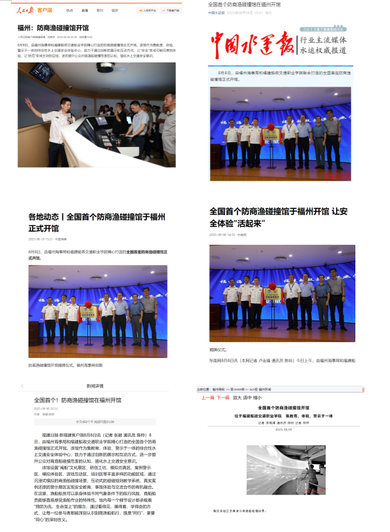 8月8日,由福州海事局和福建船政交通職業學院精心打造的全國首座防商漁碰撞館在福船園正式開館,獲得人民日報、中國水運報、東南網、新福建、福州晚報等主流媒體報道。本次活動主要情況報道如下: